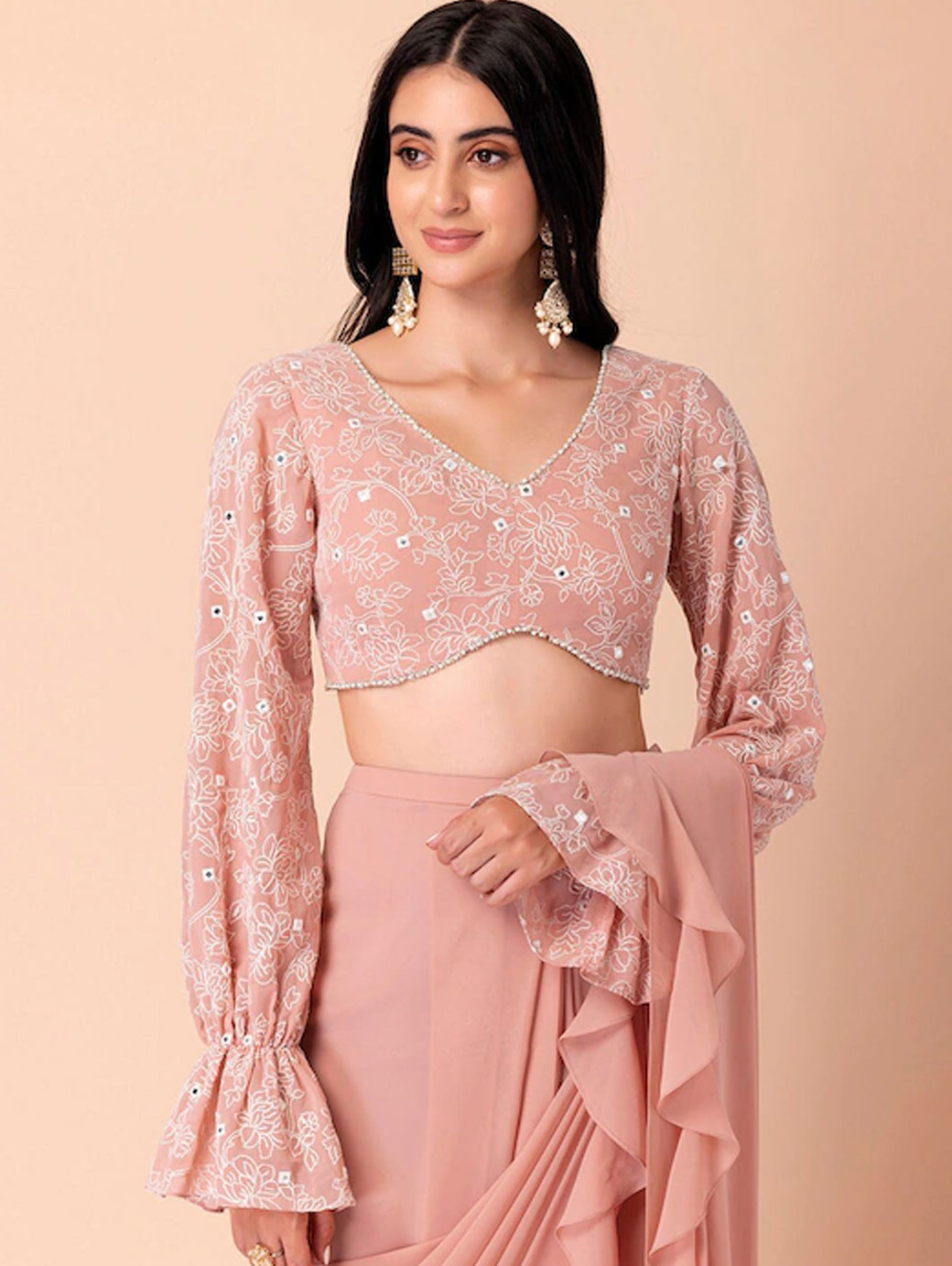 Pink crop regular top Floral embroidered V-neck, long, bell sleeve sleeves Woven georgette Concealed zip closure.