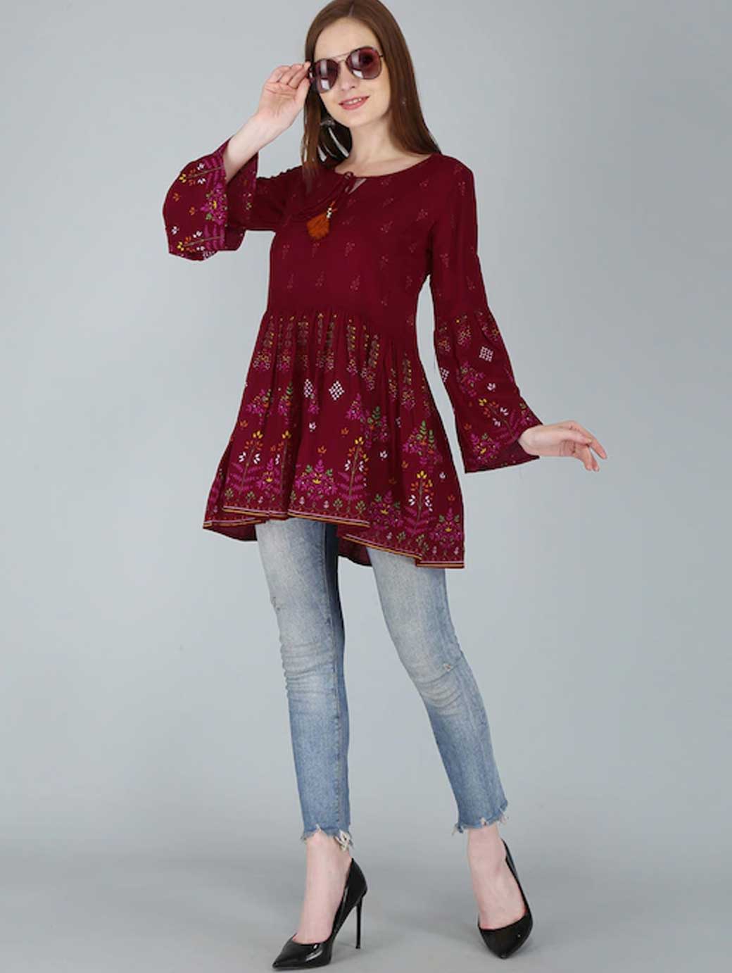 Red regular top Floral print Round neck, three-quarter, bell sleeve sleeves Tie-ups detail Knitted cotton.