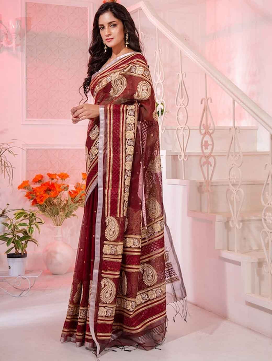 Maroon and gold-toned saree