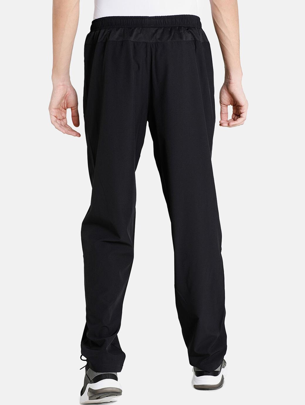 Men Black Solid Training Track Pants, has an elasticated waistband with slip-on closure