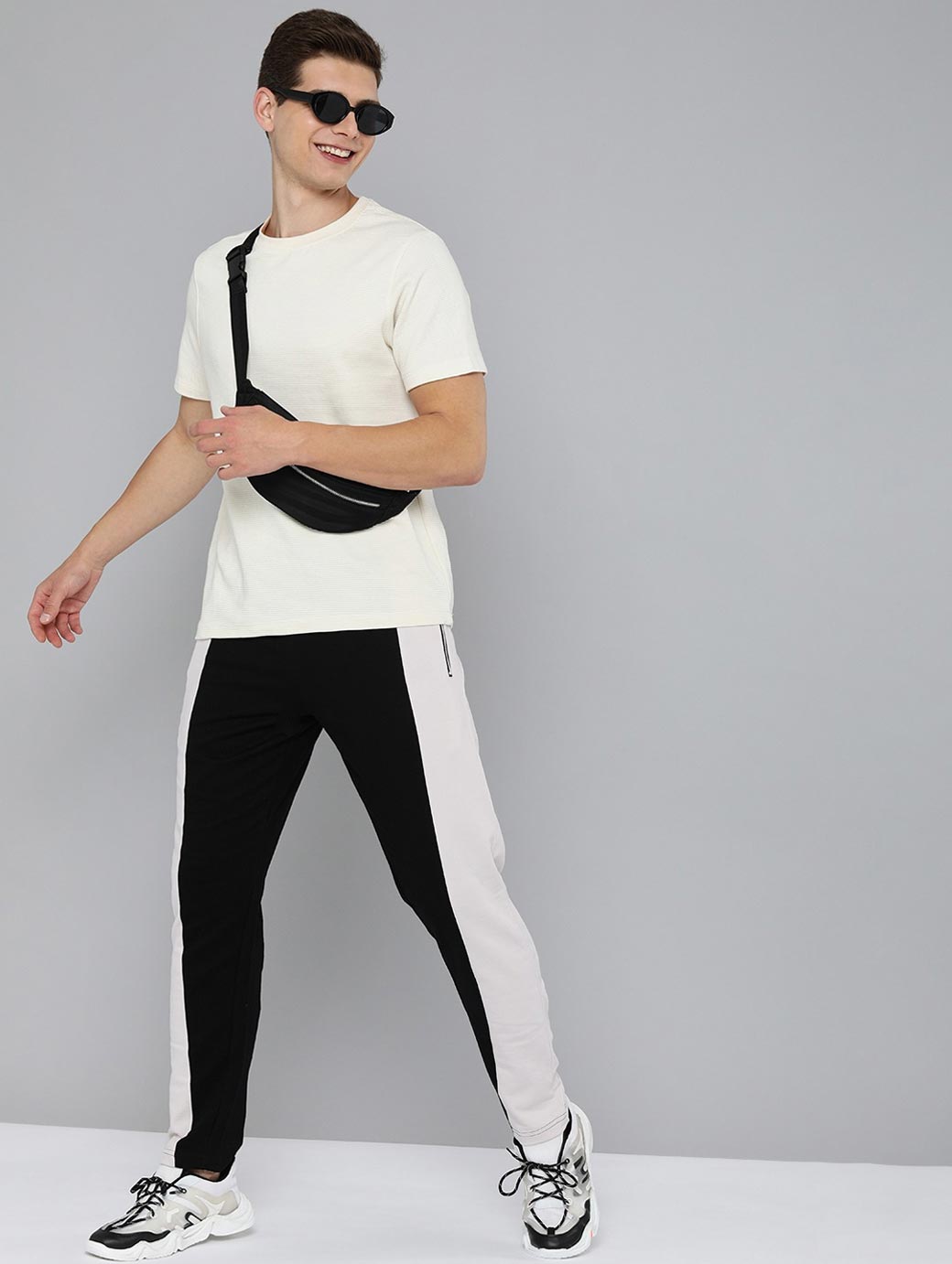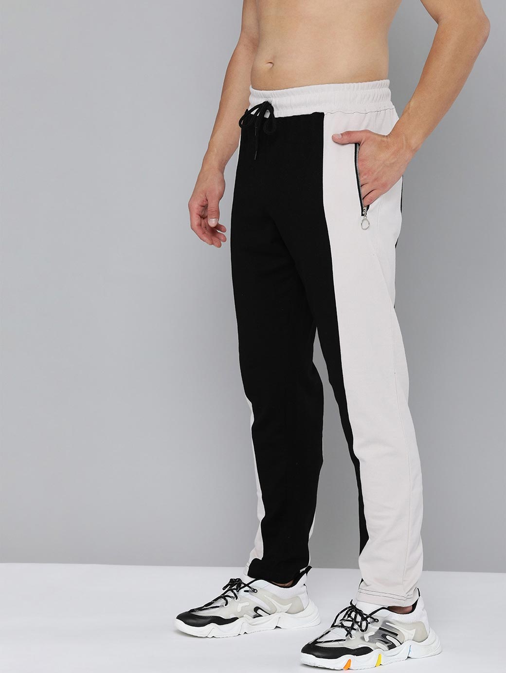 Black & White solid track pants, has an elasticated waistband with drawstring fastening, 3 pockets