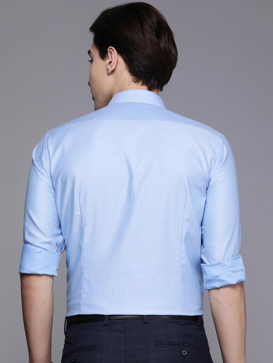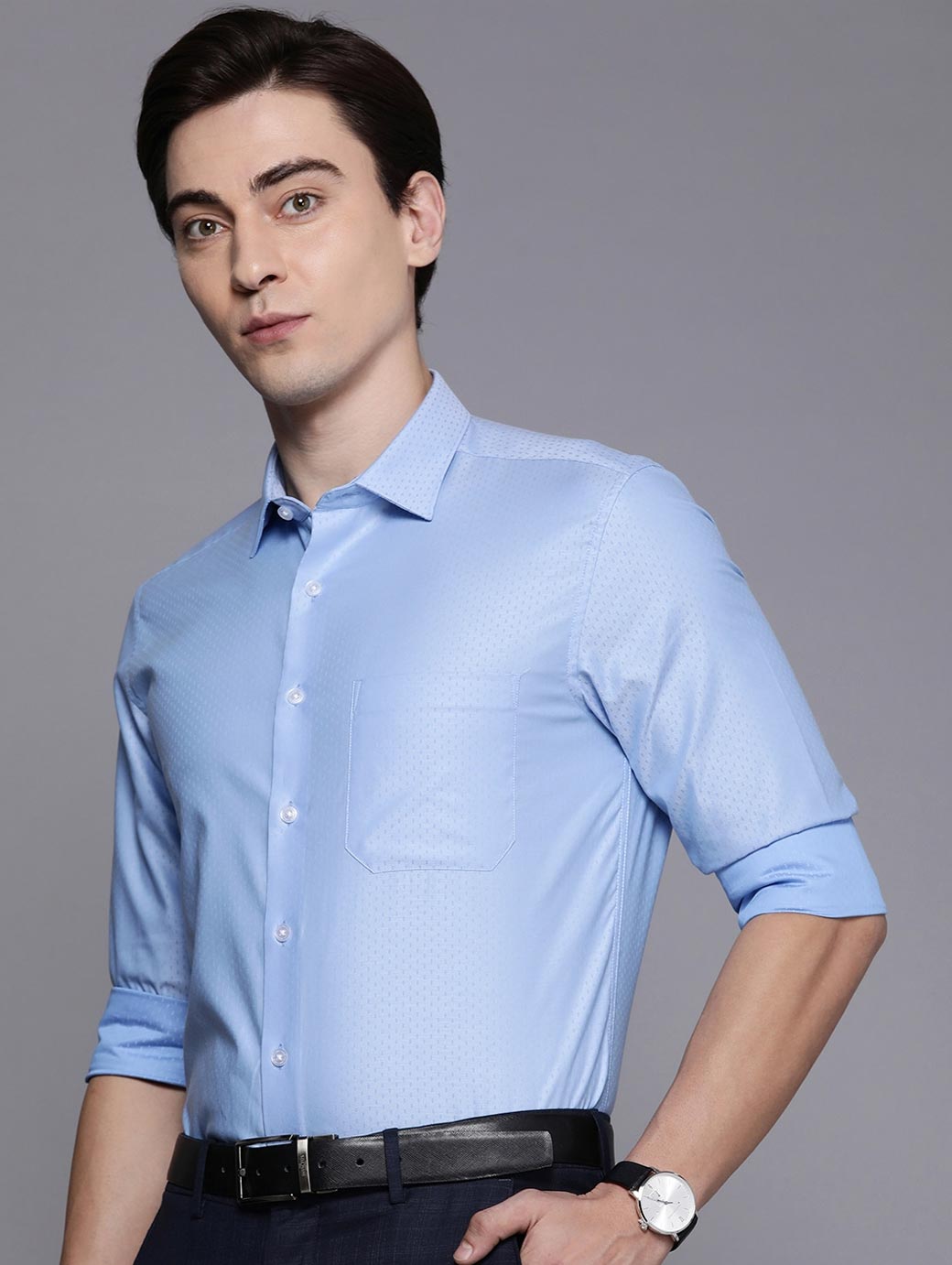 Blue printed Formal shirt ,has a spread collar, button placket, 1 patch pocket, long regular sleeves, curved hem
