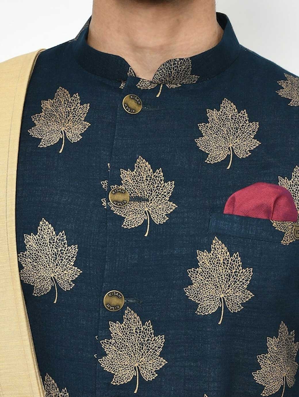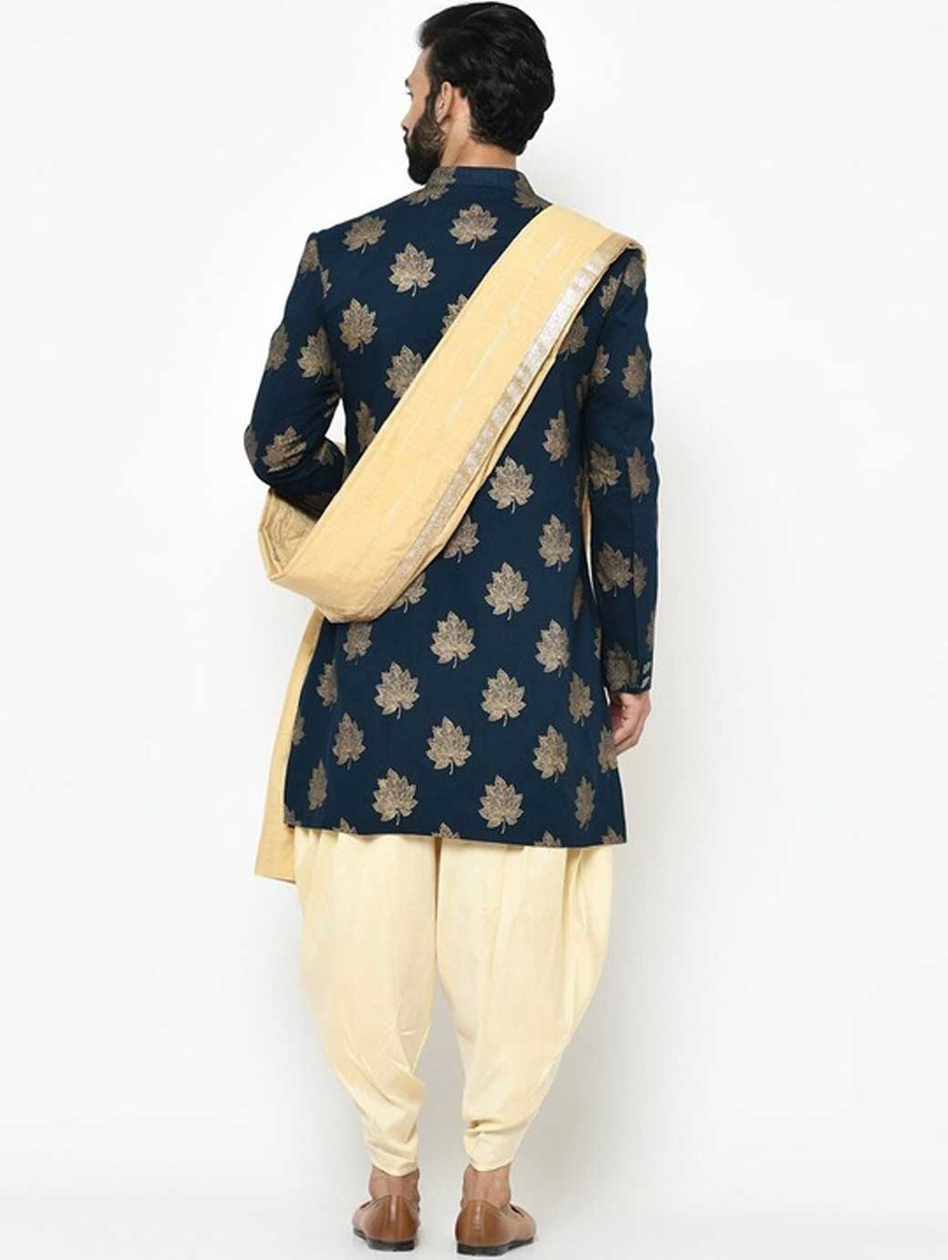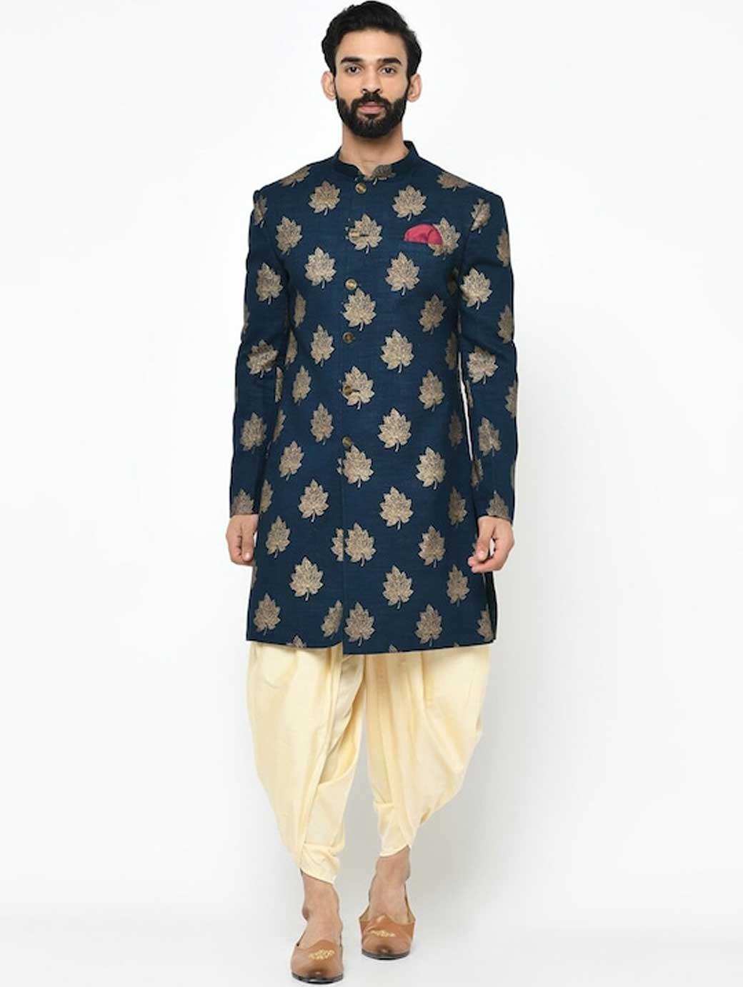 Navy Blue and gold sherwani with dhoti pants Navy Blue and gold floral printed sherwani, has a mandarin collar, front button placket, long sleeves, a chest pocket, and multiple slits Gold-coloured solid dhoti pants with pleats, has an elasticated waistband, and slip-on closure Comes with a pocket square