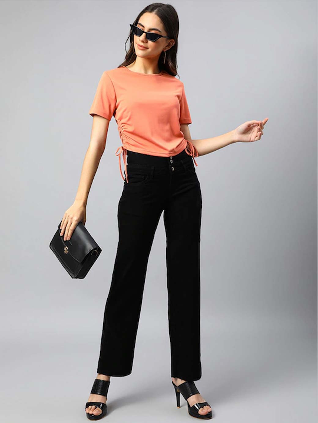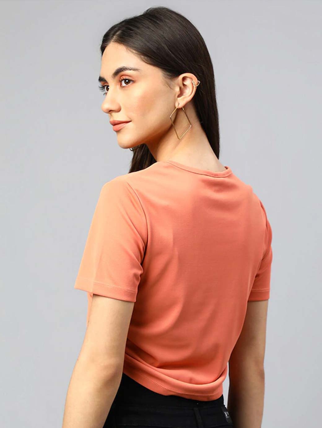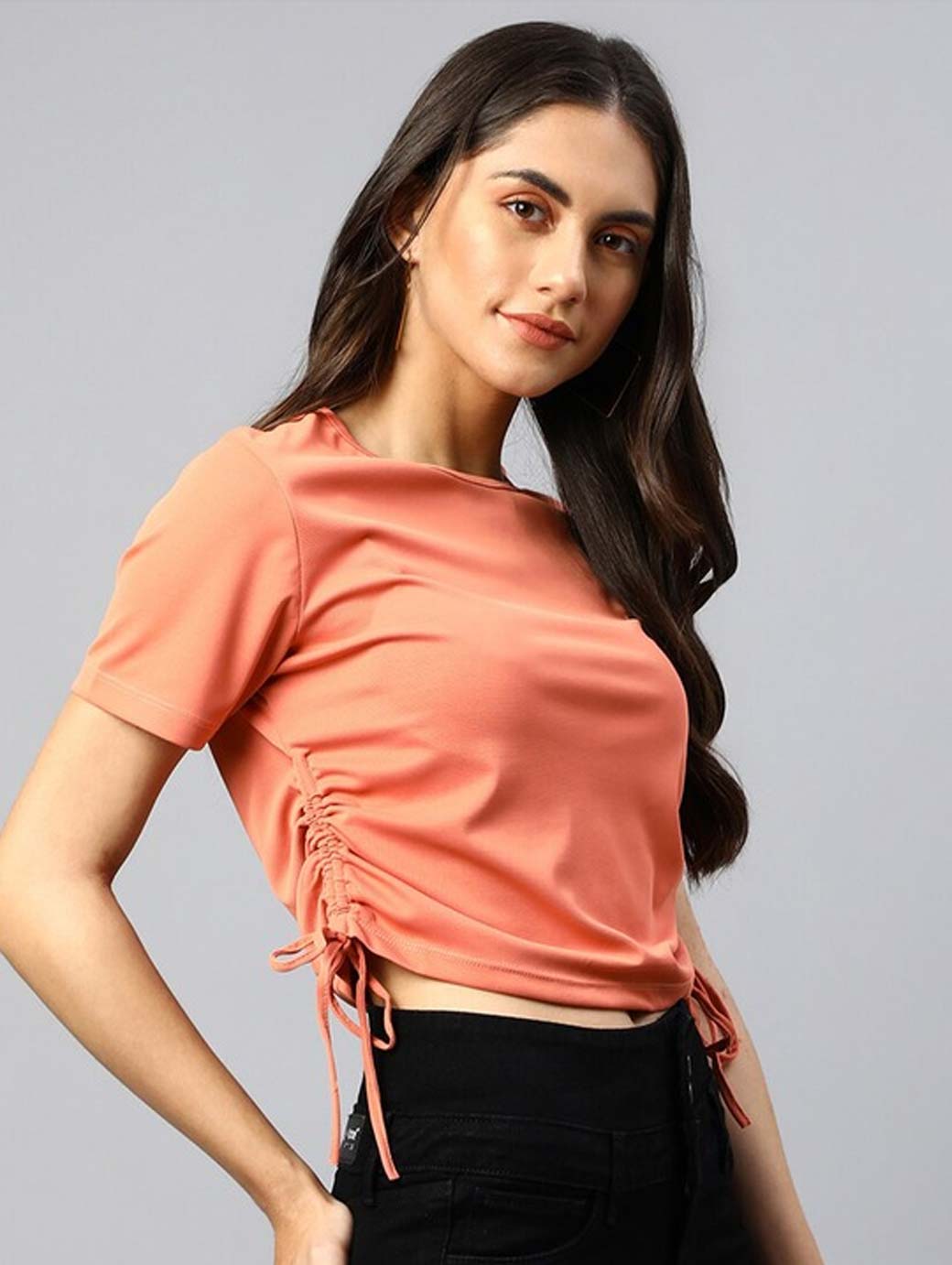 Peach Solid Round Neck Crop Side Tie Ups Top