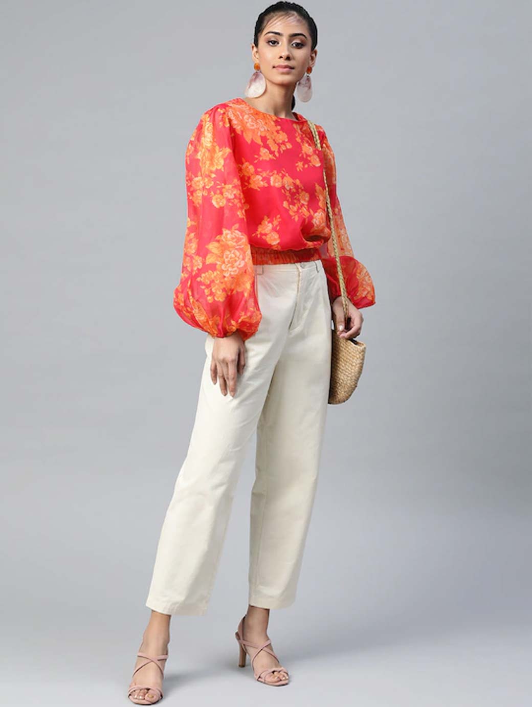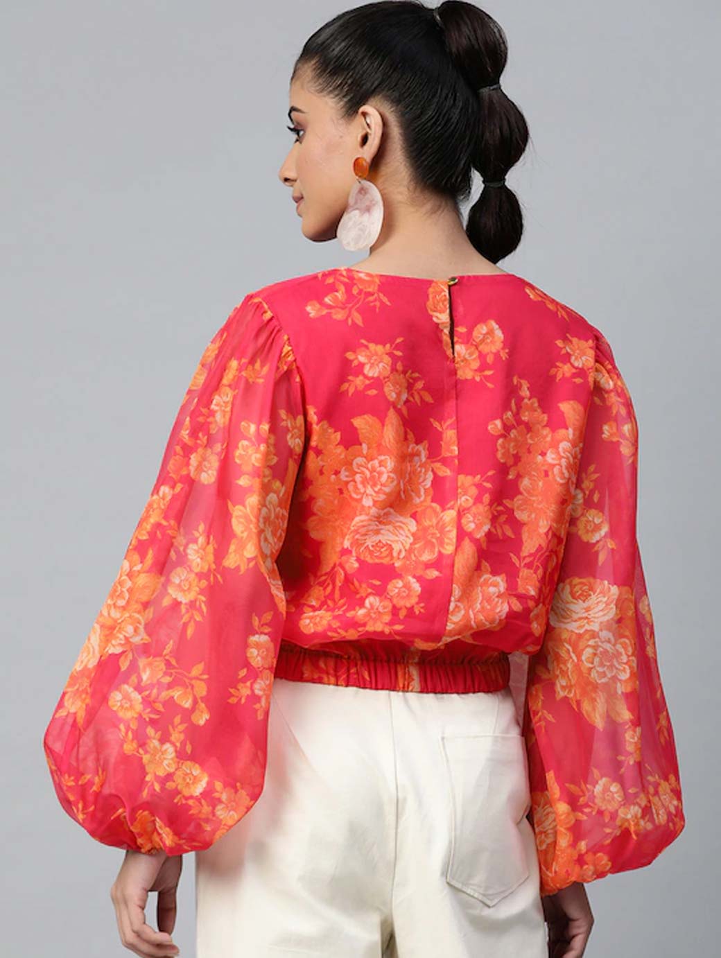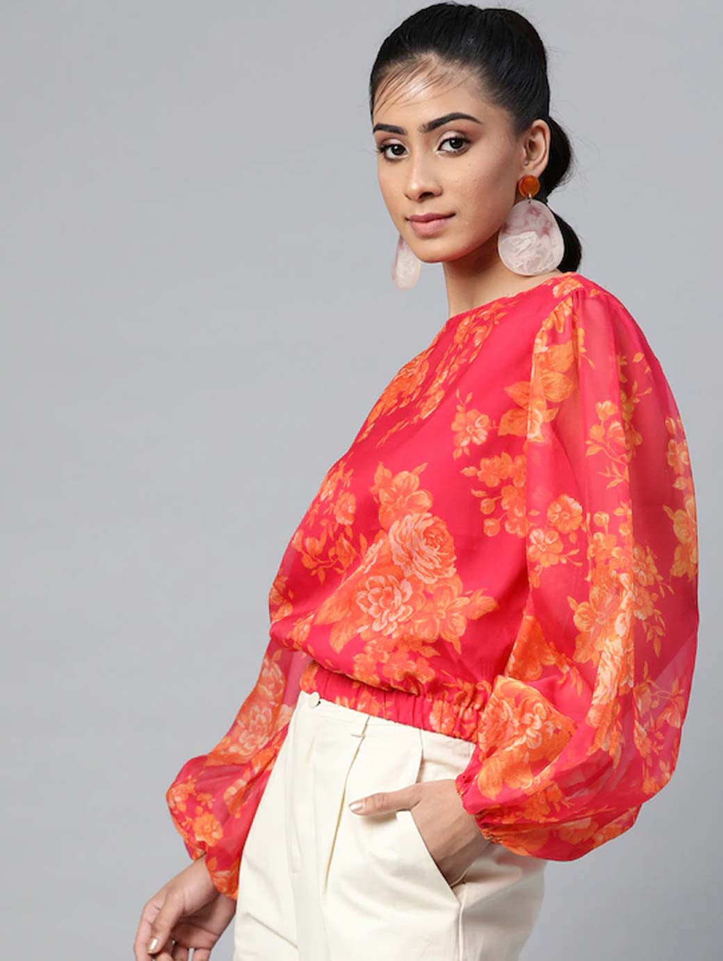 Colour: pink Top, printed woven. round neck, long puff sleeves , gathered or pleated, button closure, an attached lining, elasticated hem.