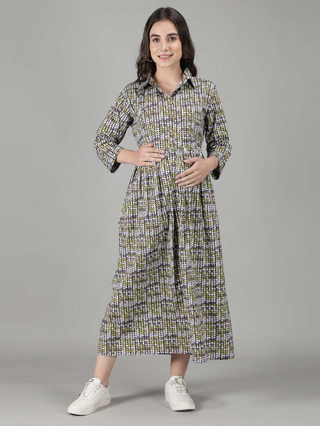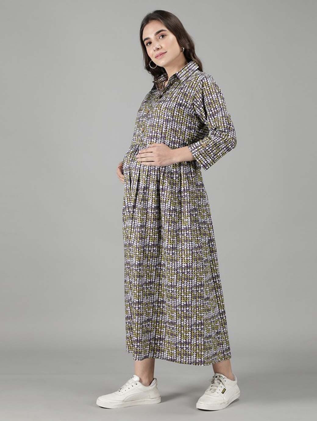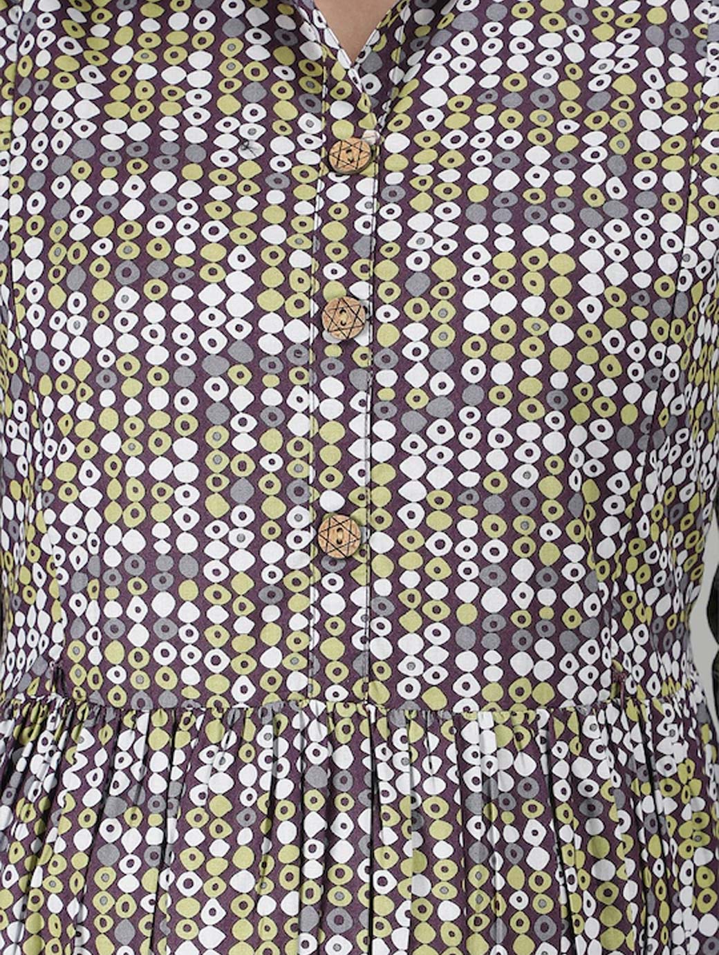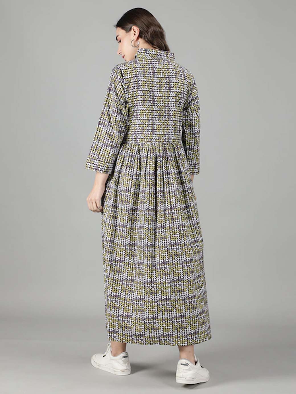 Purple and white geometric print fit & flare dress Shirt collar Long, regular sleeves Maxi length in flared hem Cotton fabric Concealed zip closure