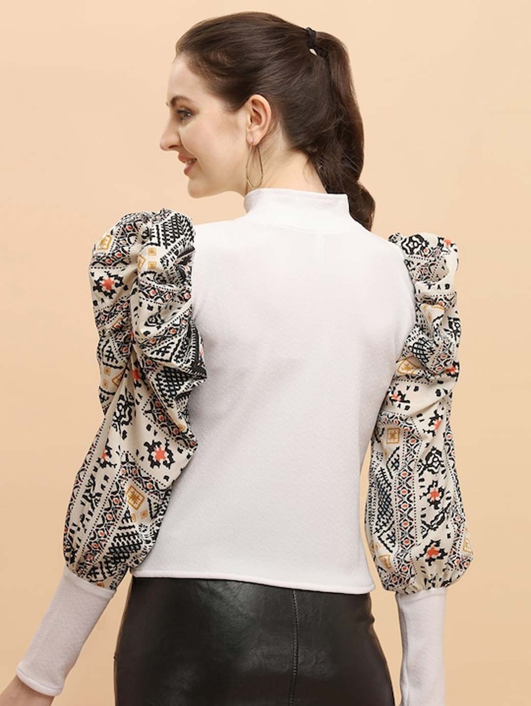 White regular fitted top, Solid High neck, long, puff Ethnic Motifs Printed sleeves Knitted crepe.