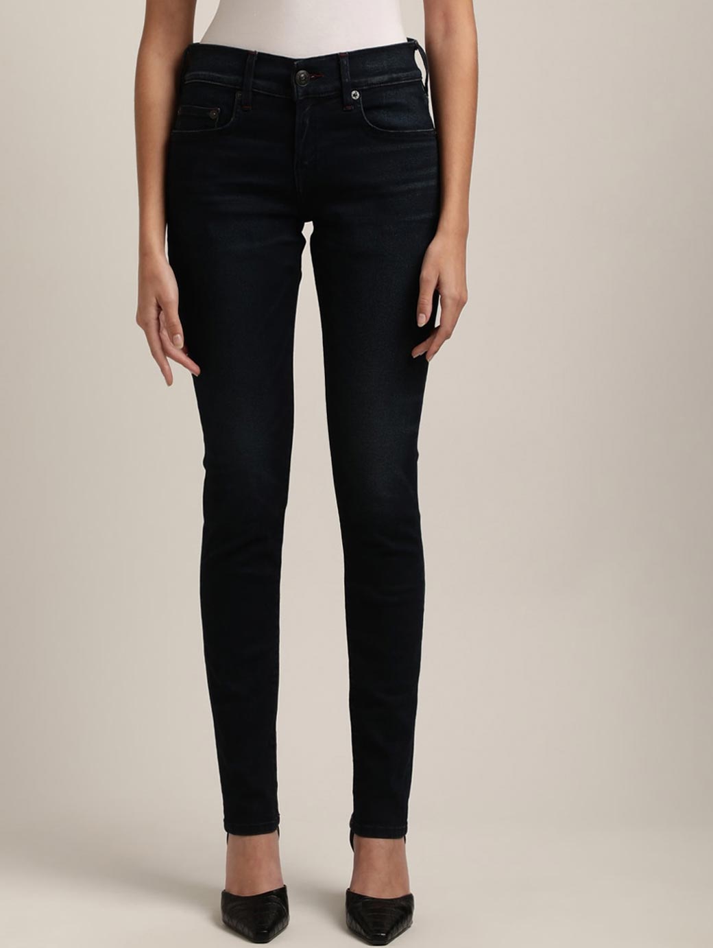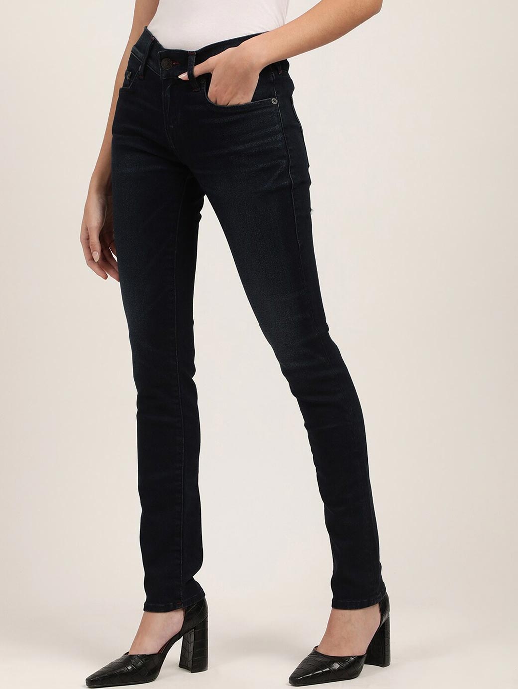 Dark shade, no fade black jeans Skinny fit, mid-rise Clean look Non stretchable 5 pocket Length: cropped