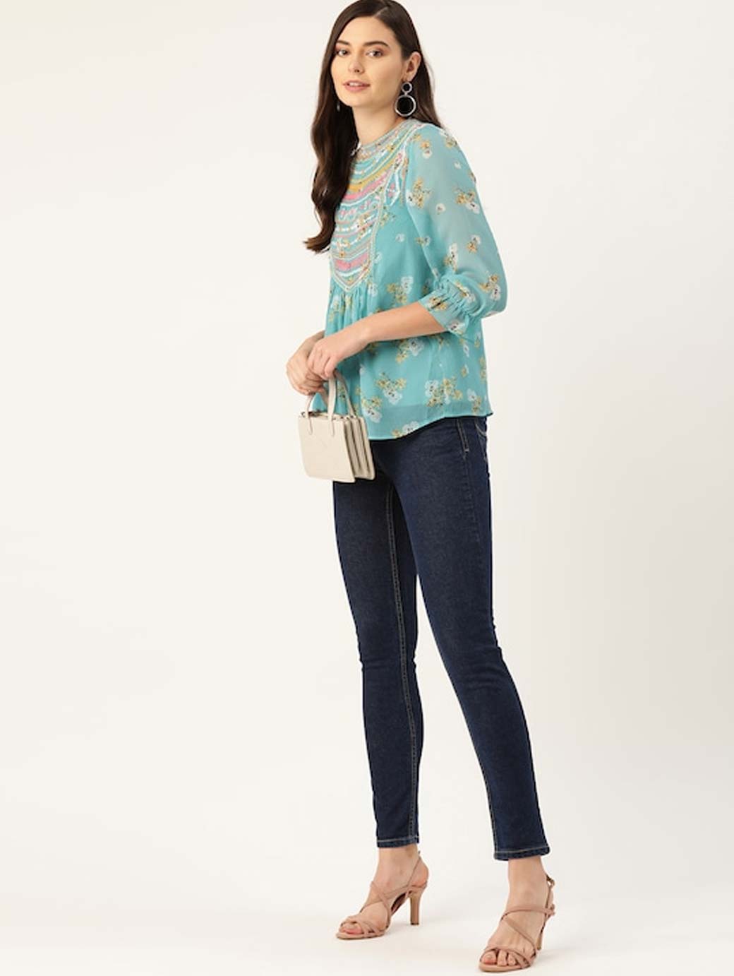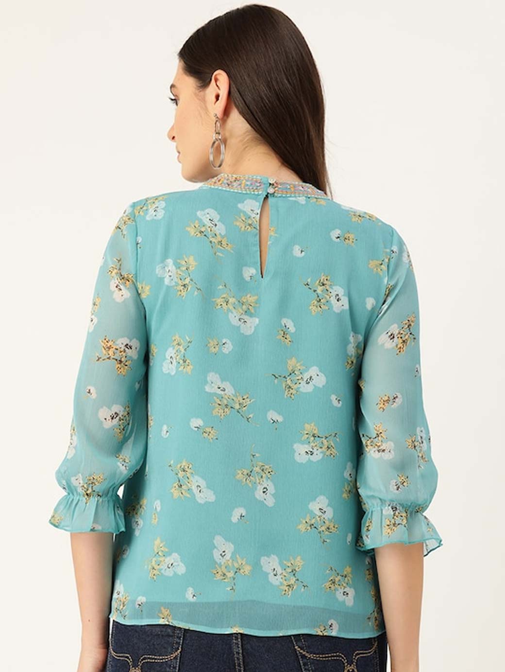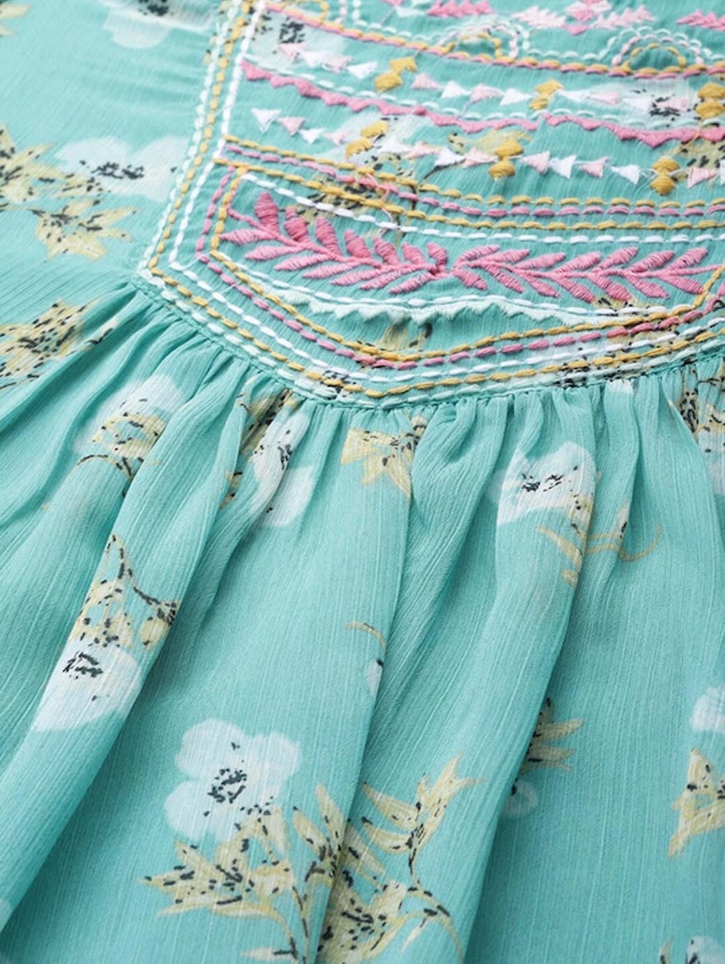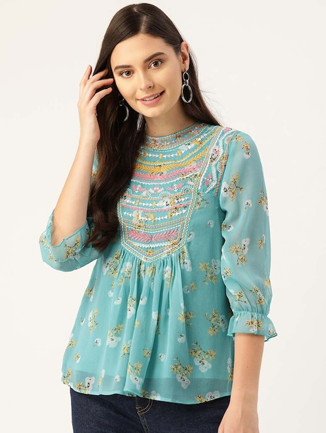 Blue and Yellow floral print woven A-line top with ruffle, embroidered and gather detail, has a round neck, three-quarter sleeves, and button closure