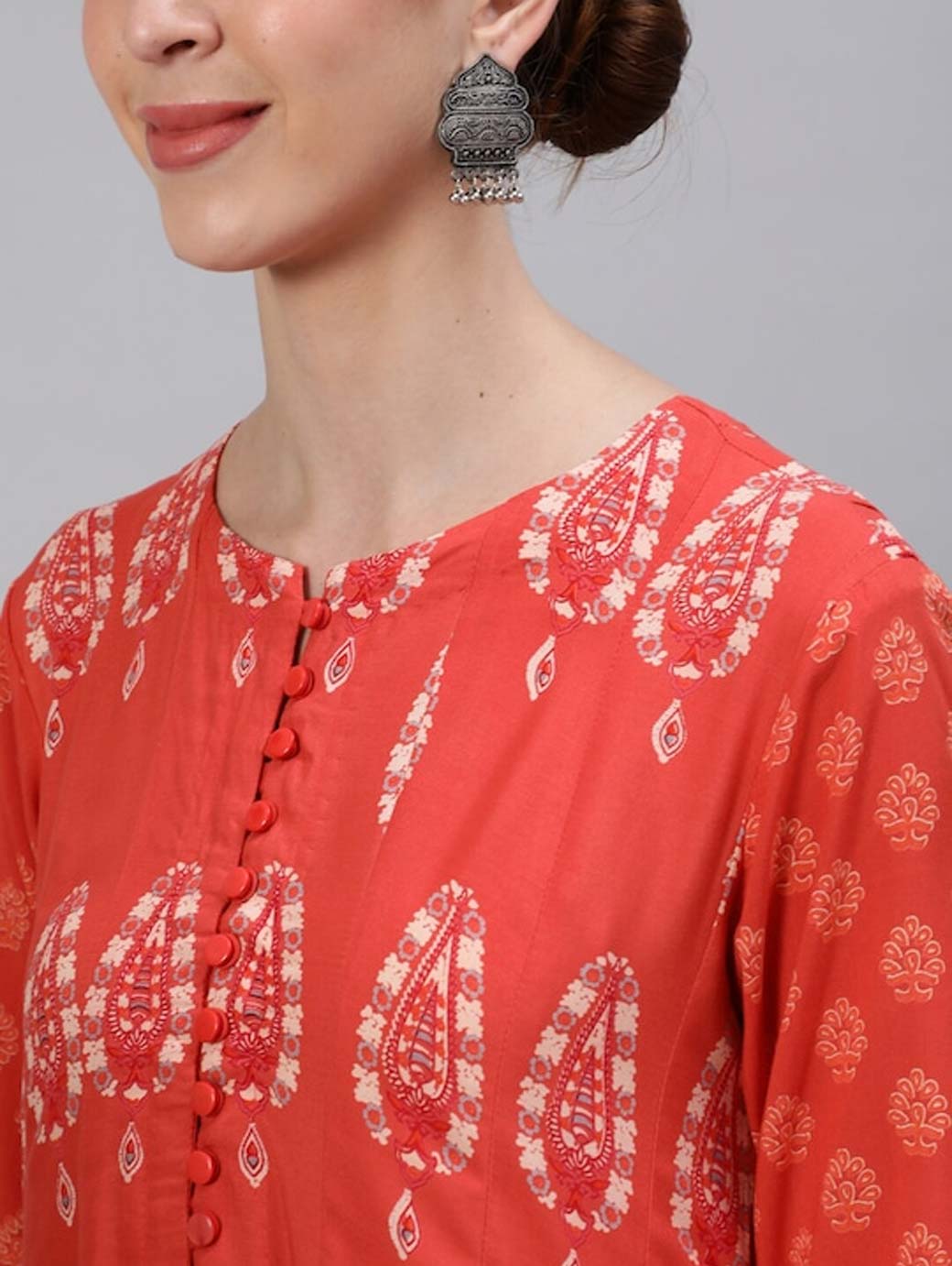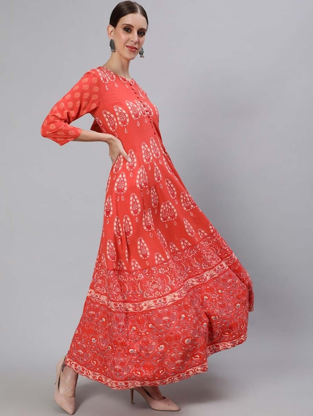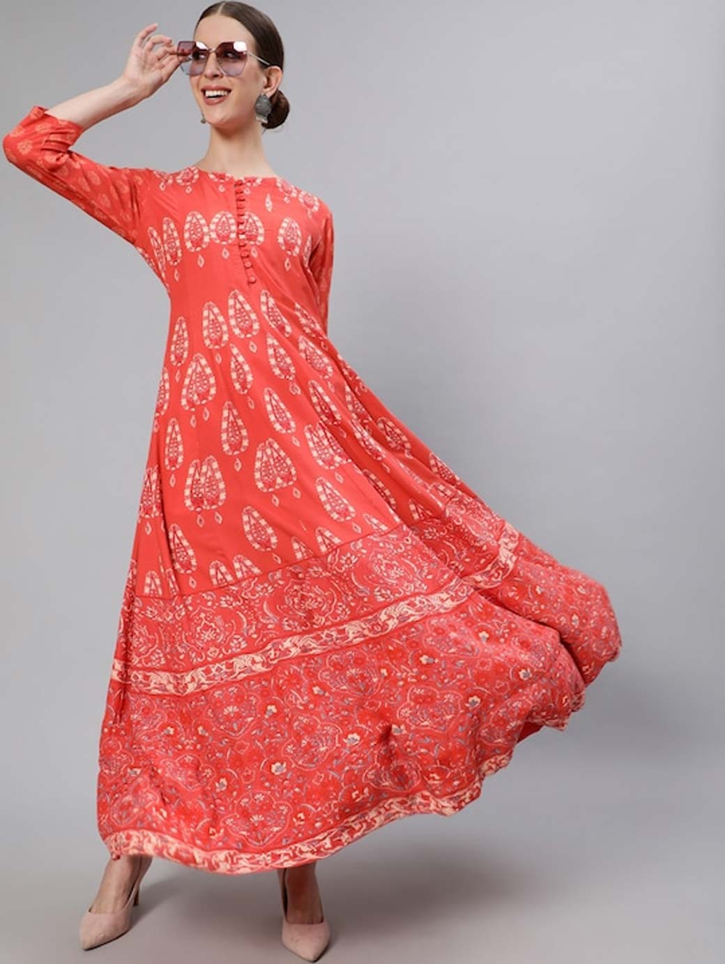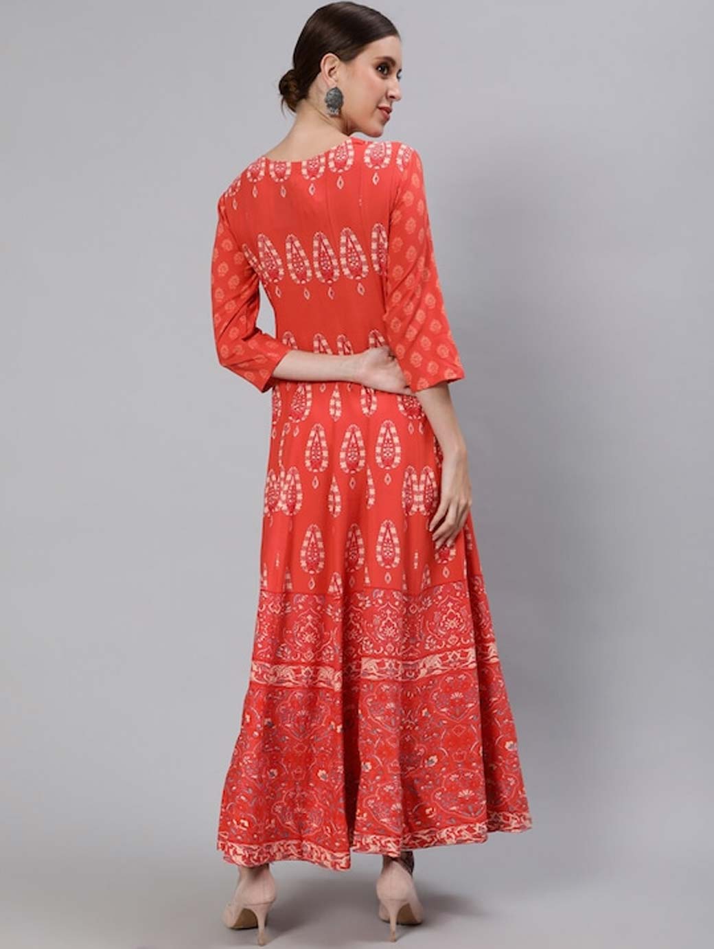 Peach-coloured and white Geometric printed Three-quarter, regular sleeves Anarkali shape with empire style Ankle length with flared hem Machine weave regular cotton