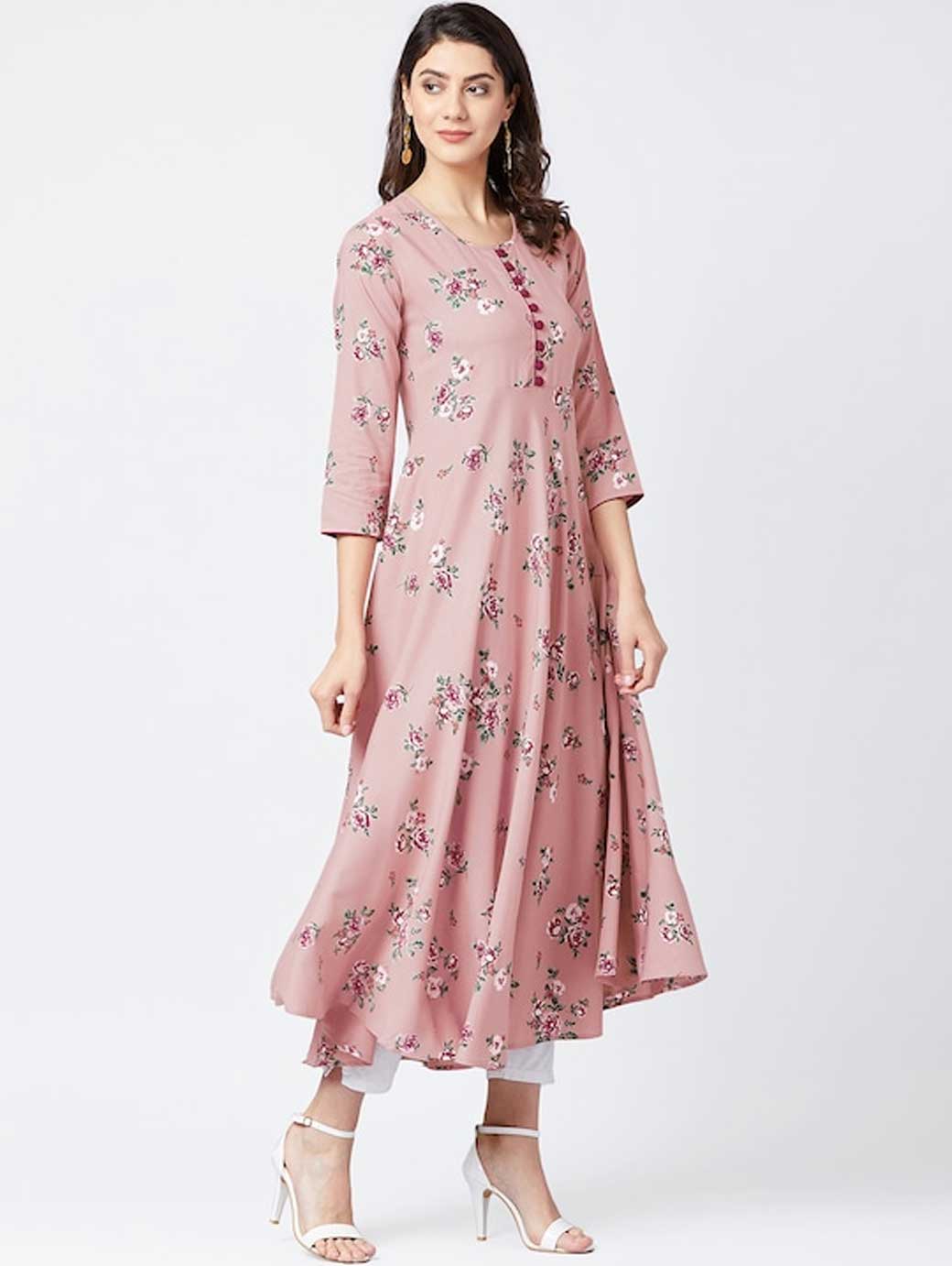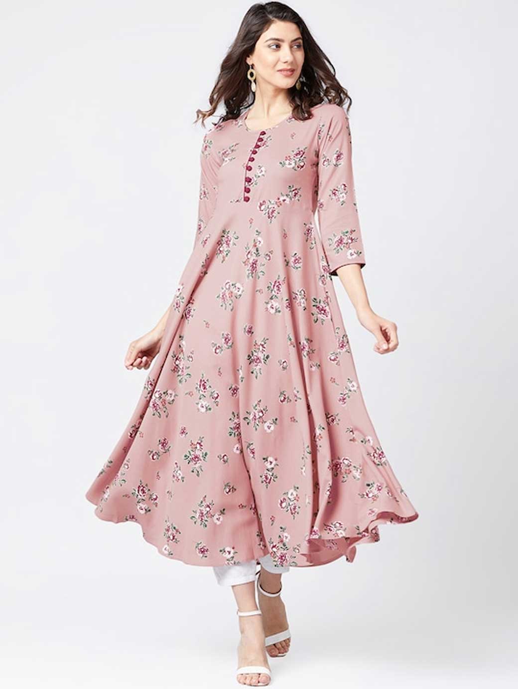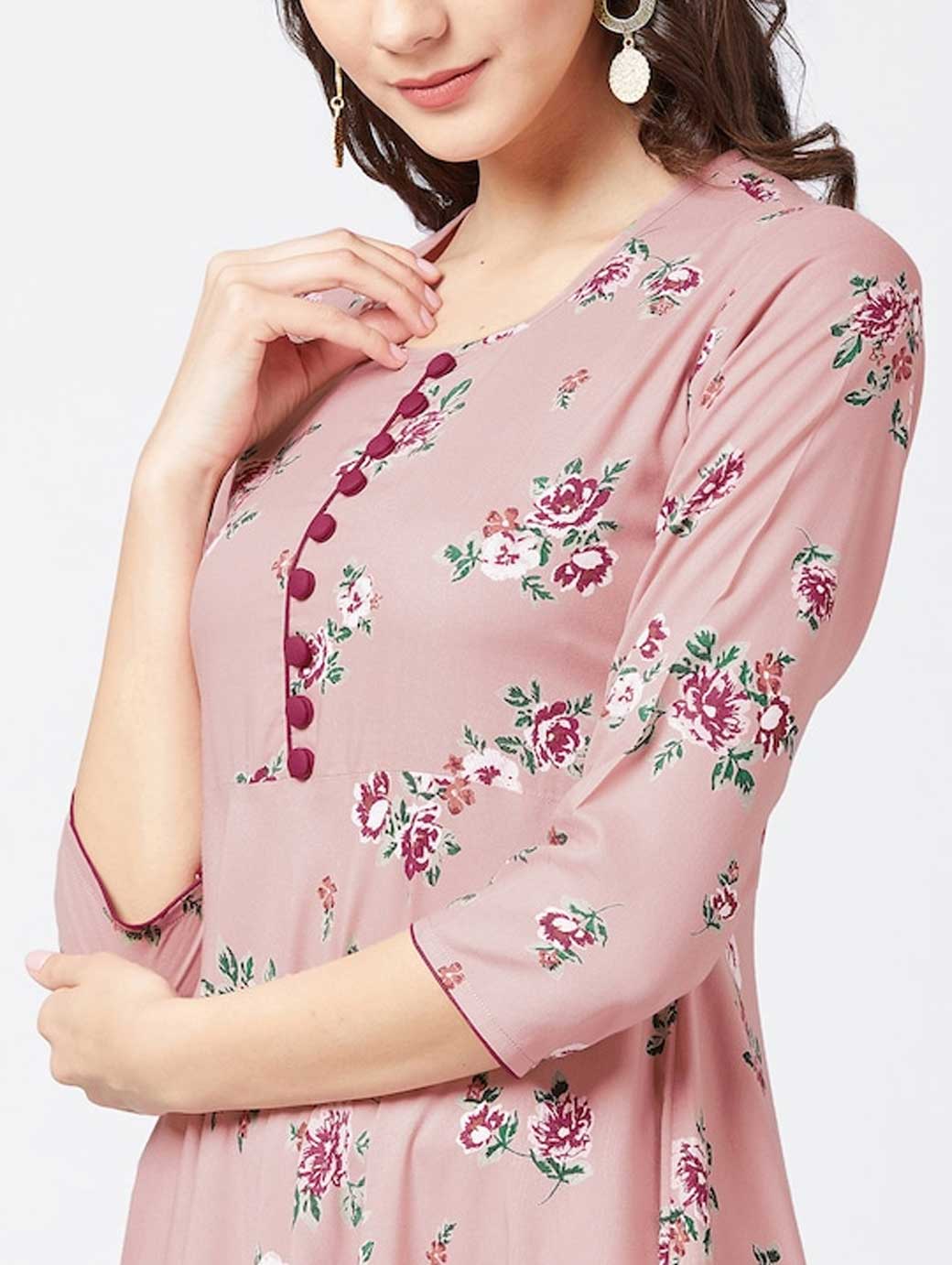 Pink printed anarkali kurta, has a round neck, three-quarter sleeves, flared hem