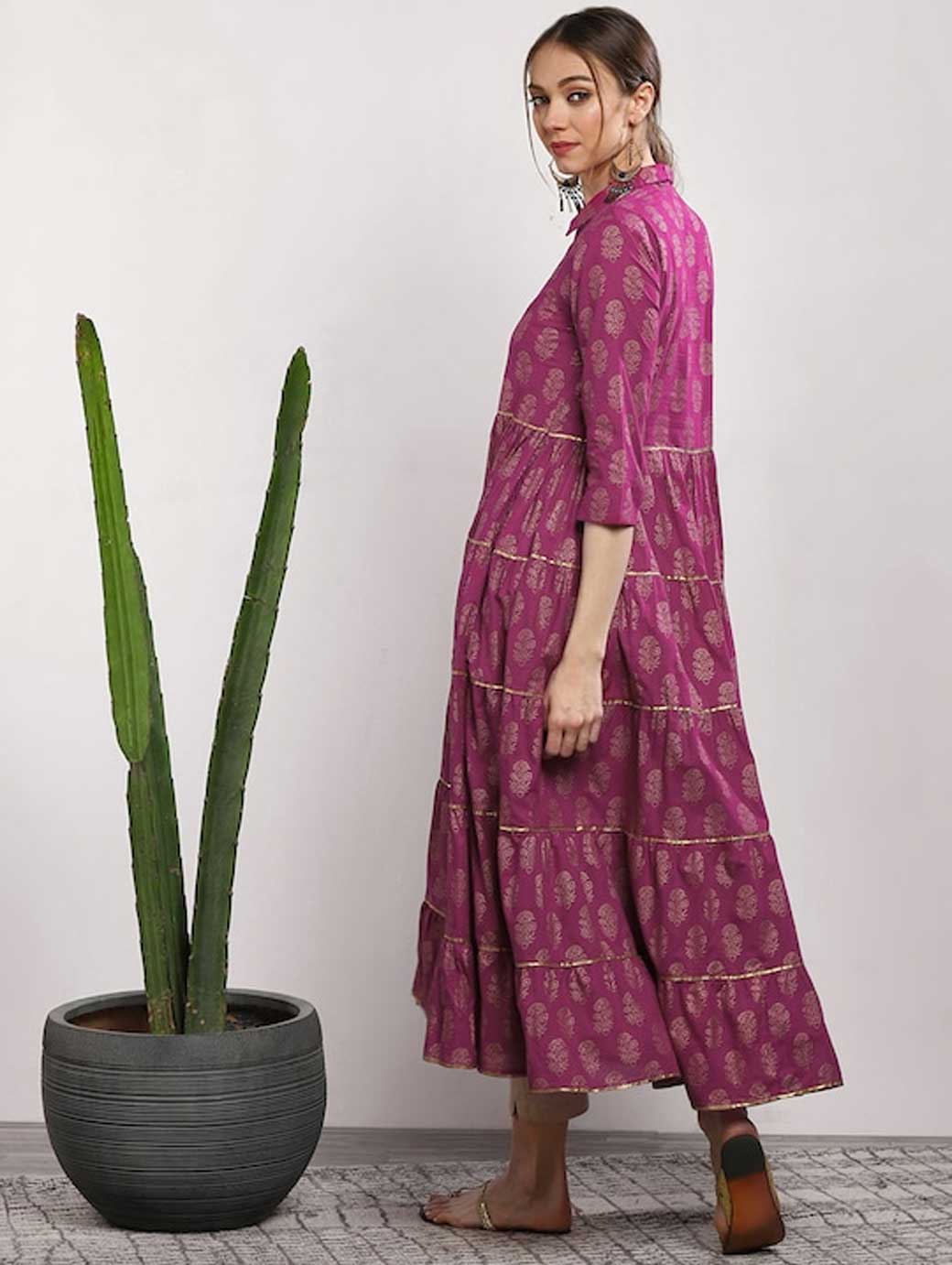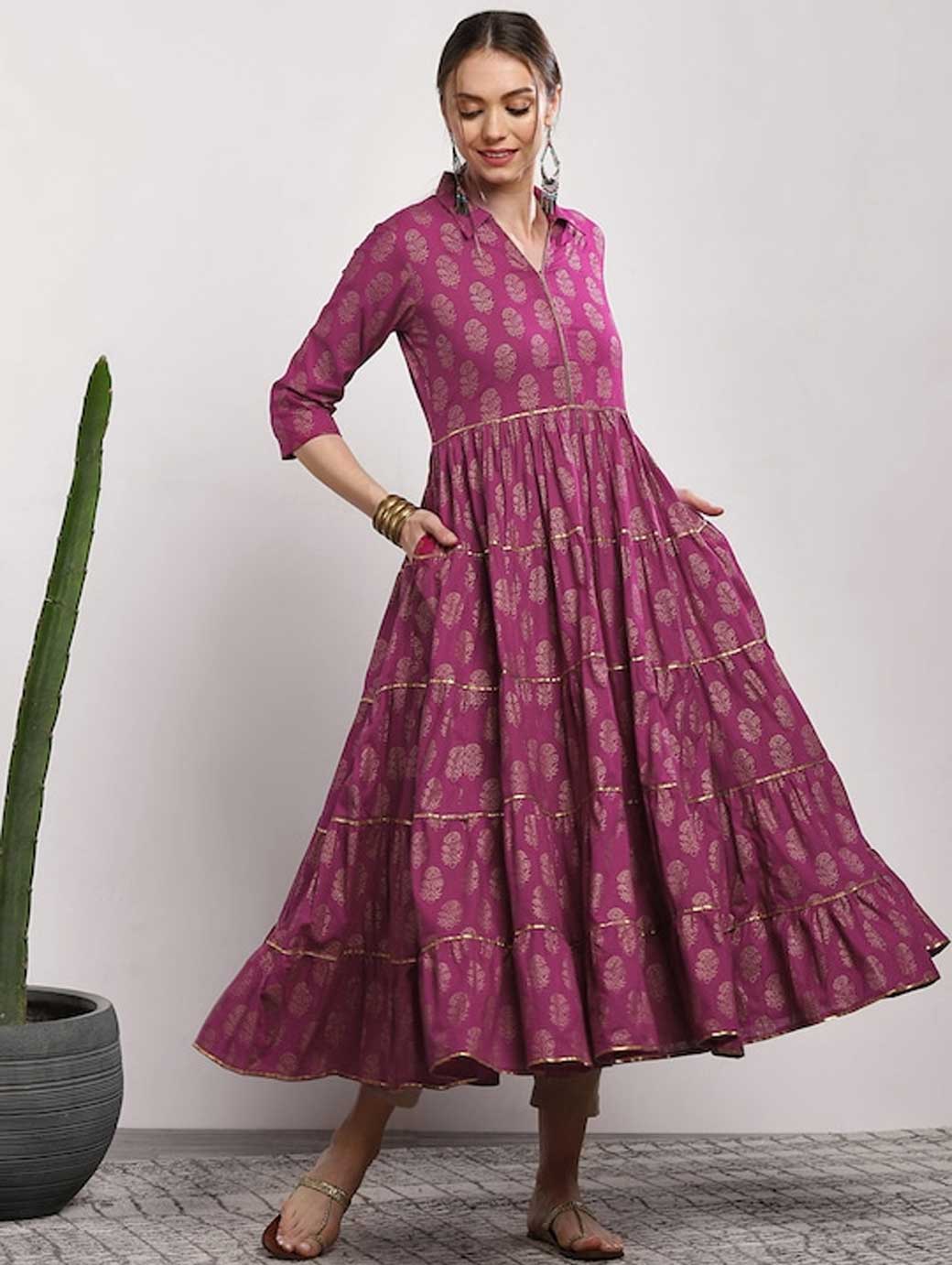Pink Printed Tiered Anarkali Kurta, has a round neck, three-quarter sleeves, and flared hem This product does not come with a mask. The mask on the model is only for styling purpose.