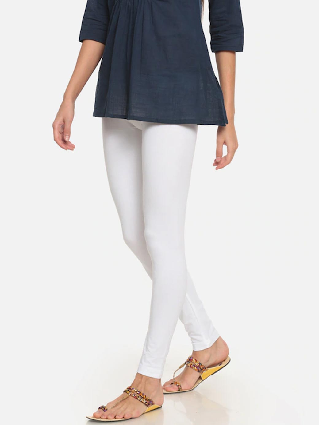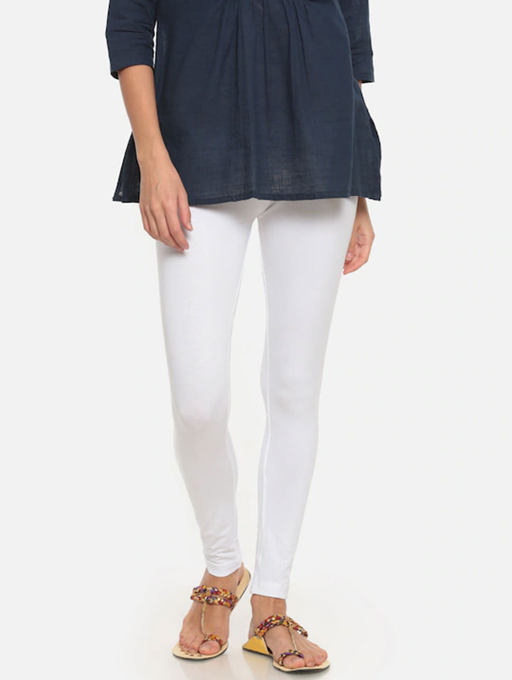 A pair of white solid mid-rise ankle-length leggings, has an elasticated waistband with a slip-on closure.