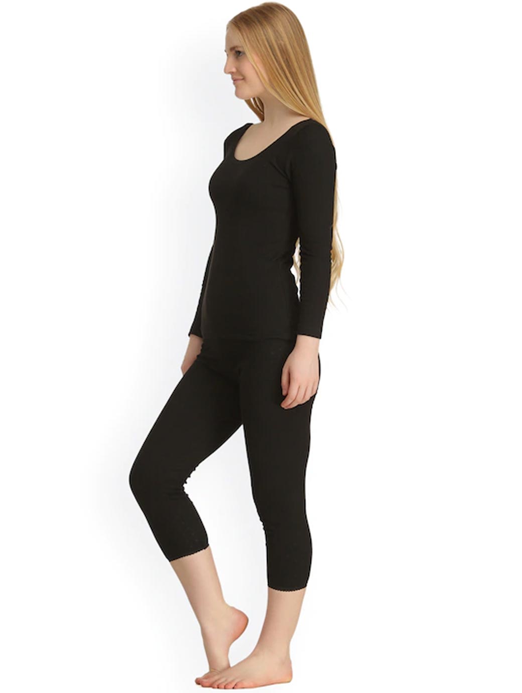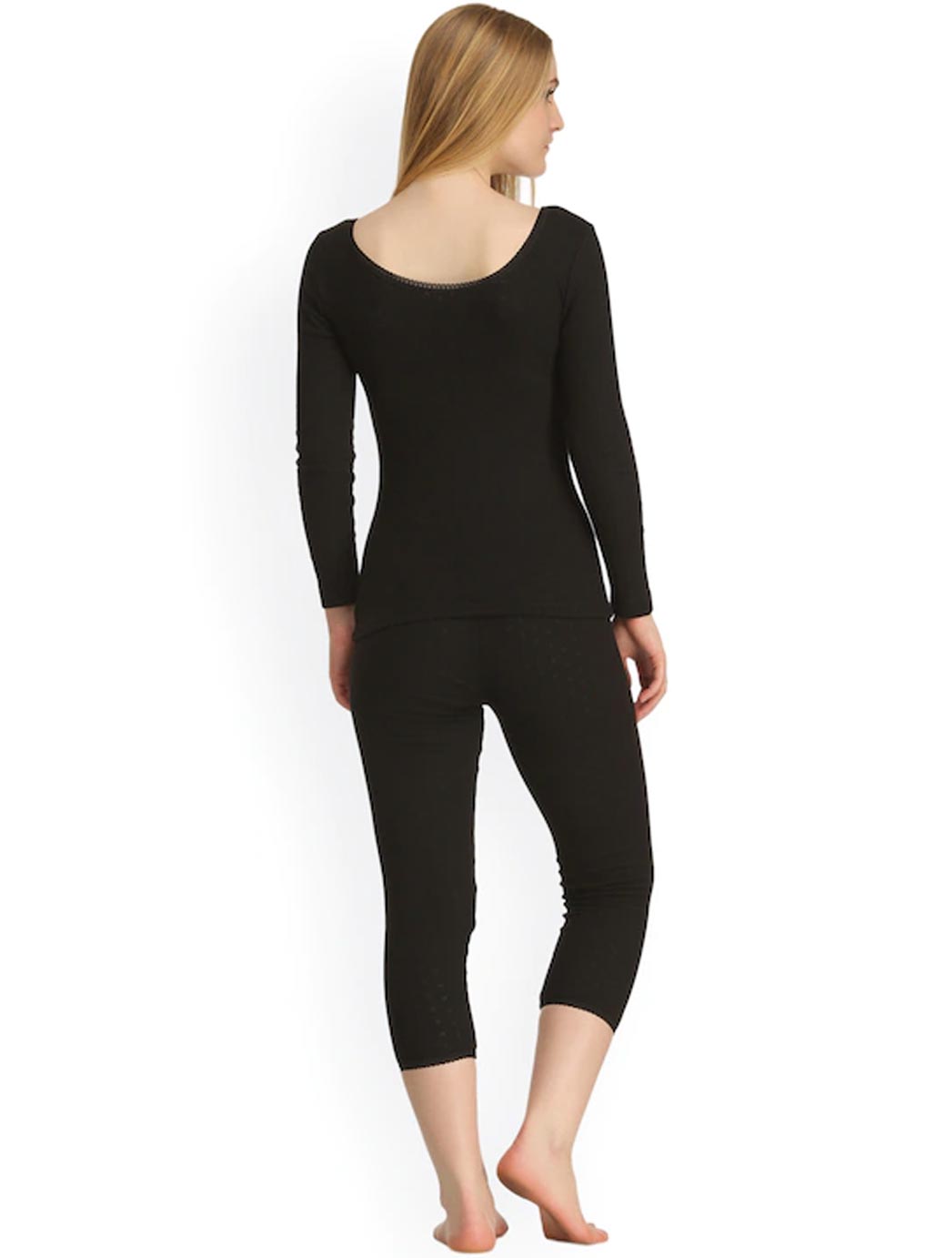 This black thermal set consists of a top and a pair of leggings Black knitted thermal top in a patterned weave, has long sleeves Black mid-rise regular leggings in a patterned weave, has an elasticated waistband